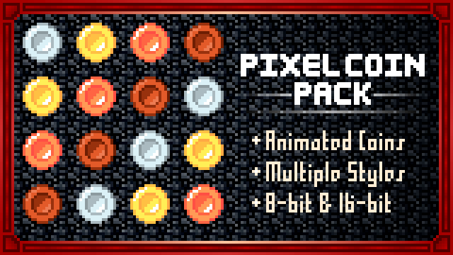 Animated pixel art coin pack, ready for use in 2D games. Includes gold, silver, bronze, and ruby coins, with smooth animations and well-organized files.